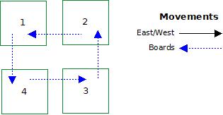 East/West pairs start by moving down 1 table, then move down 2 tables skipping their home table.