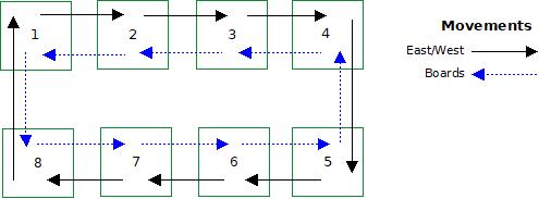 East/West pairs start by moving up 6 tables. Then East/West move down 2 tables. At round 4 East/West reach their home table so they move down 4 tables.